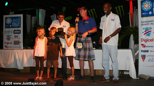 Sean Gill claimed his second King of the Carnival title in the recently-completed Barbados Rally Carnival, and can look forward to another trip to Europe to broaden his rallying horizons. He and co-driver Michael Cummins received the Andrew Phillips Memorial Trophy at The Boatyard from Irish television producer and enthusiastic supporter of Rally Carnival, Plum Tyndall.